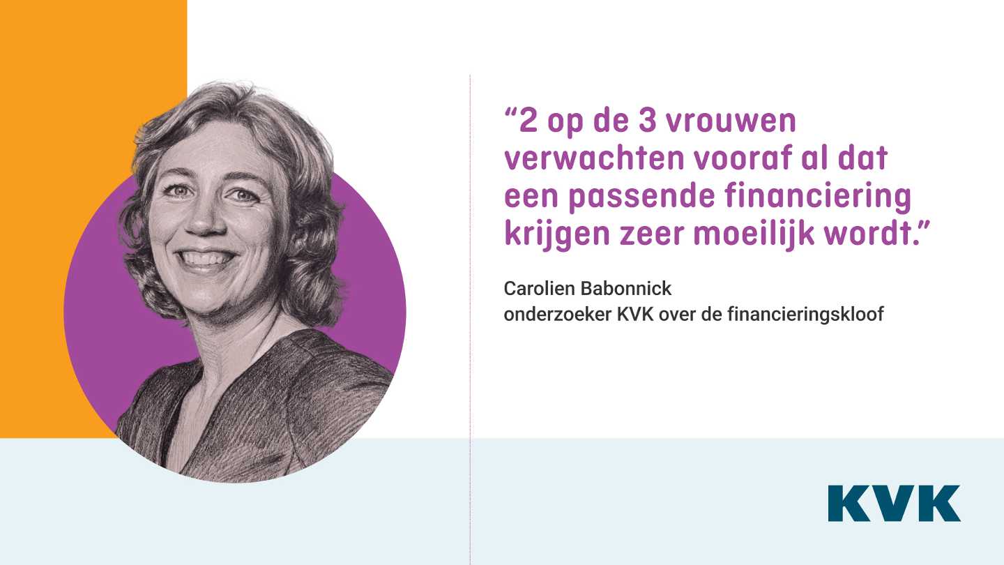 Carolien Babonnick is als onderzoeksspecialist en duider bij KVK betrokken bij dit onderzoek. ‘Een van de dingen die we zien, is dat het aanvragen van financiering voor iedereen nog steeds moeilijk is. Zowel mannen als vrouwen vinden het lastig, en dat is eigenlijk al jarenlang hetzelfde’, vertelt ze over de uitkomsten. 'Maar', vervolgt ze, 'dat betekent niet dat er geen verschillen zijn. Zo zien we bijvoorbeeld dat twee op de drie vrouwen vooraf al verwachten dat het zeer moeilijk zal worden om passende financiering te krijgen, waar dat geldt voor bijna de helft van de ondervraagde mannen.'