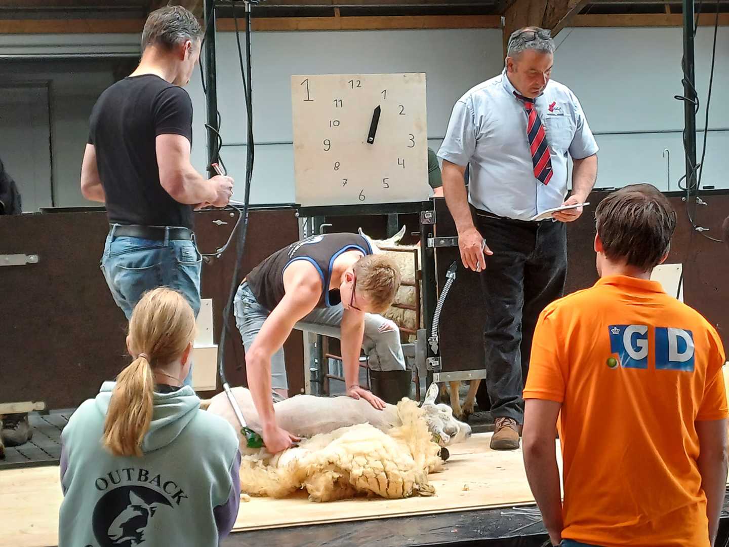 Bij de kampioenschappen is ook plek voor aanstormend talent. Martin van Veelen uit ’t Harde is met 18 jaar veruit de jongste deelnemer. Hij doet mee in de klasse gevorderden machinaal, voor aankomende topscheerders, en eindigde in de finale op een mooie vierde plek. ‘Het is een machtig mooi vak. Ik werk voor een schaapherder, zijn zoon is mijn beste vriend. Daar heb ik het scheren ontdekt, ging met een scheerder mee op zijn werk om te helpen, schapen aangeven. Ik ging steeds vaker mee en op een dag had de scheerder een tweede motor meegebracht, toen kon ik zelf ook aan de slag. “Twee kunnen meer dan één”, zei hij. Je hebt wel echt spierballen nodig en het is zwaar op je rug. En je hebt een goeie grip nodig op de scheermachine. Je kunt het schaap in bedwang houden door het tussen je knieën te klemmen, dan heb je je handen verder helemaal vrij.’